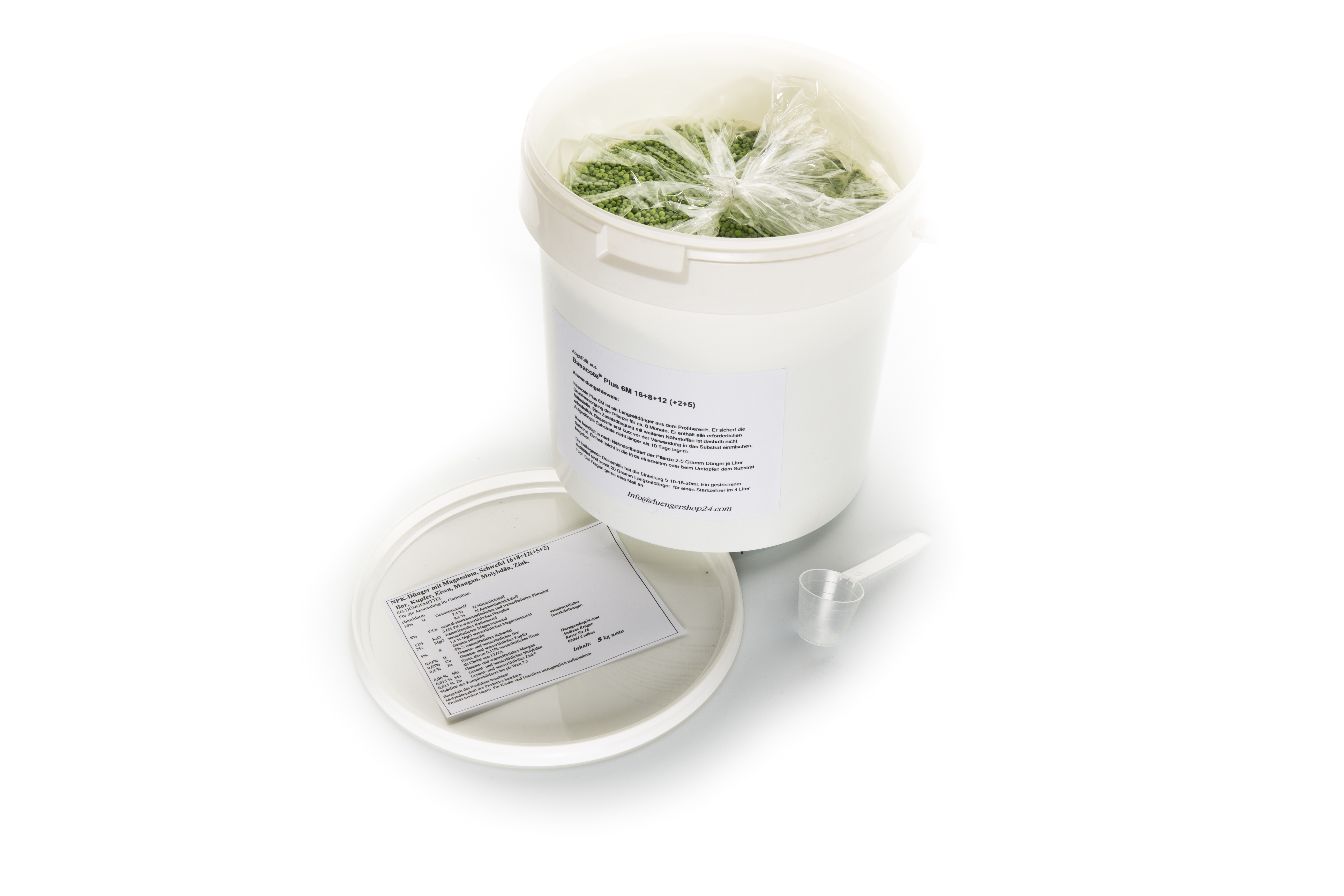 Deklaration: NPK-Dünger 16+8+12(+2+5) mit Bor, Kupfer, Eisen, Mangan, Molybdän, Zink. Umhüllt (100%) mit Komplexbildner EDTA
