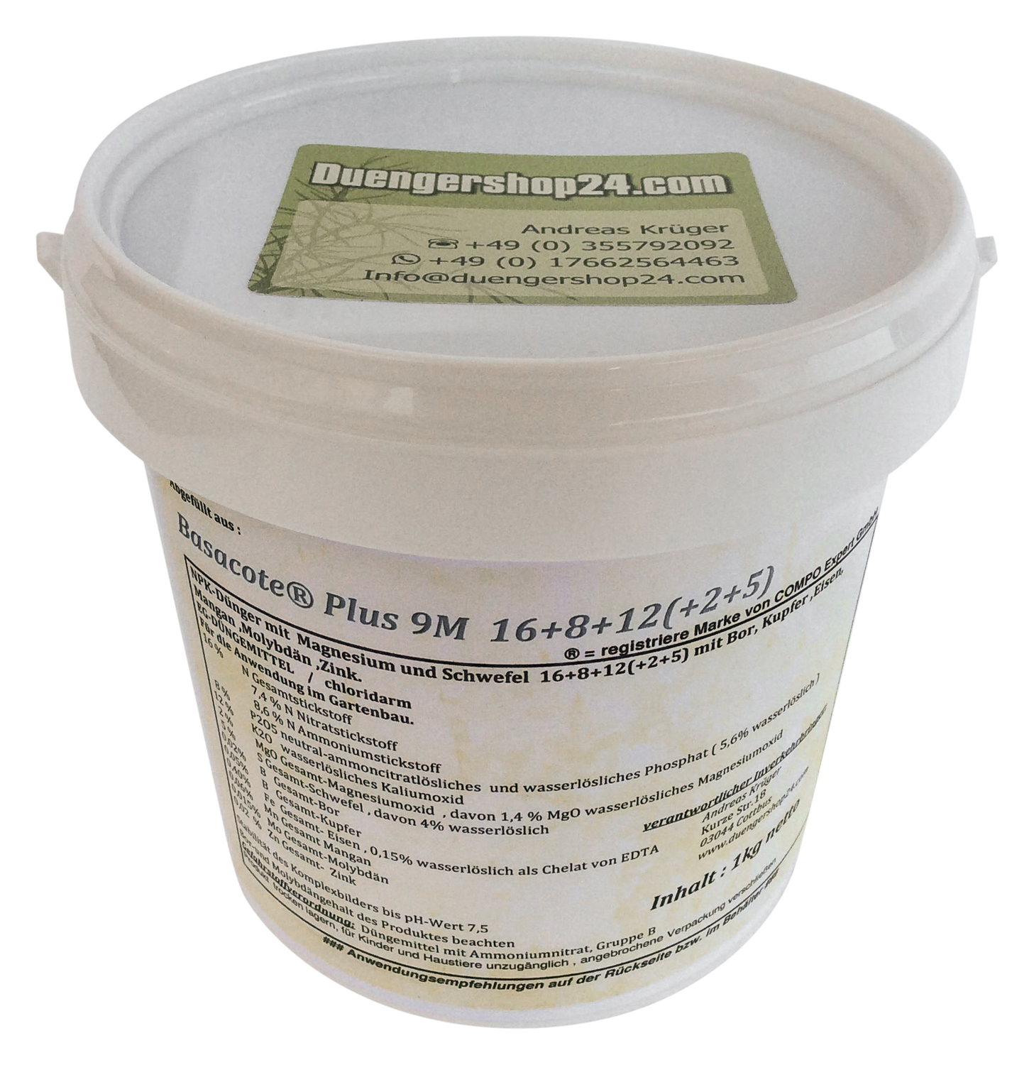 Deklaration: NPK-Dünger 16+8+12(+2+5) mit Bor, Kupfer, Eisen, Mangan, Molybdän, Zink. Umhüllt (100%) mit Komplexbildner EDTA